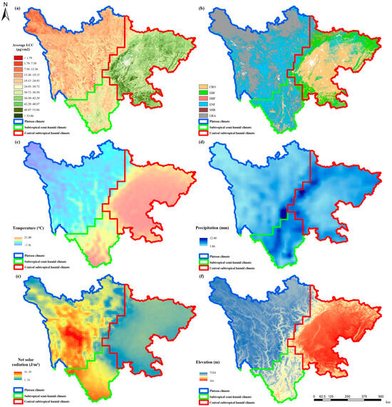 Distribution of influencing factors in different climate zones (the blue line frame is the plateau climate zone, the green line frame is the subtropical semi-humid climate zone, and the red line frame is the central humid climate zone). In (b), vegetation types include Cropland (CRO), Evergreen Broadleaf Forest (EBF), Deciduous Broadleaf Forest (DBF), Evergreen Needleleaf Forest (ENF), Shrubland (SHR), and Grassland (GRA). (a) LCC; (b) vegetation types; (c) temperature; (d) precipitation; (e) net solar radiation; (f) elevation.