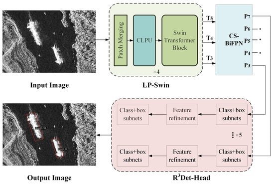 The workflow of our LPST-Det is illustrated in Figure 1. LPST-Det is built on the R3Det framework, an advanced one-stage model for inclined object detection. The proposed detector comprises three components, including LP-Swin, CS-BiFPN, and R3Det-Head. Initial feature maps are extracted by the LP-Swin backbone, and then CS-BiFPN augments them into powerful multi-scale feature representations. Subsequently, the R3Det-Head performs regression and classification, producing the final results.