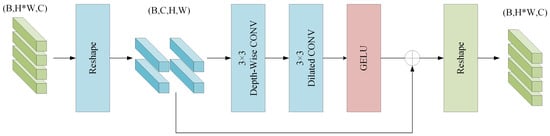 Figure 5 illustrates our CLPU’s composition, comprising a 3 × 3 depth-wise convolution, a 3 × 3 dilated convolution, a GELU activation function, and a residual connection. In the CLPU module, the depth-wise convolution is employed to extract local features. Subsequently, the dilated convolution increases the receptive field, facilitating the extraction of context information surrounding the ship target. Finally, the GELU activation function and the residual connection improve the learning ability of this convolutional module.