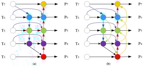 We add two kinds of longitudinal cross-scale connections, including two top-down and three bottom-up cross-scale connections, as shown in Figure 7b. , , , , and are input feature maps, where , , and are extracted by the LP-Swin backbone (as illustrated in Figure 2), is derived from a 3 × 3 stride-2 convolution on , and is obtained in a similar way on . Then, through multiple transverse and longitudinal connections, they are combined in various resolutions to construct a feature pyramid , , , , . To enhance clarity, we illustrate the implementation process using as an example.