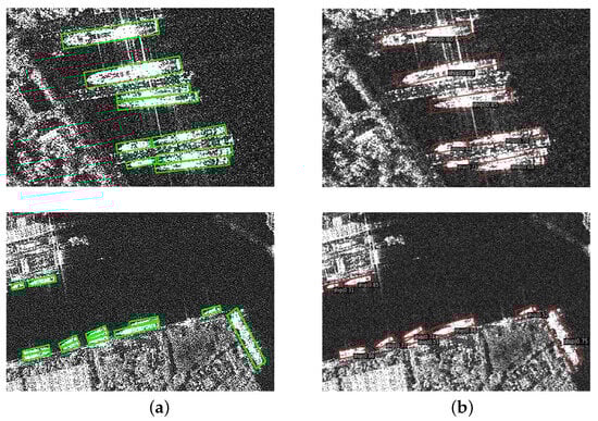 Detection results of densely parallel ships. (a) Ground truth; (b) LPST-Det.