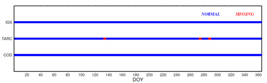 Missing broadcast ephemeris of the international GNSS service (IGS), the Test and Assessment Research Center of China Satellite Navigation Office (TARC), and the missing BDS ephemeris products obtained from the Center for Orbit Determination in Europe (COD) from DOY 001 to 365, 2022.