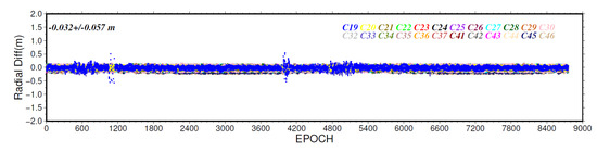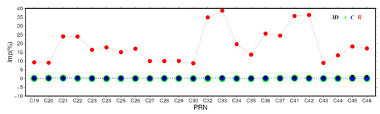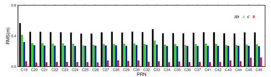 Table 5. The accuracy of SISRE_ORB from B-CNAV navigation messages was better than that of the D1. Due to the improvement in the orbit radical direction, the improvement ratio of SISRE_ORB reached 8.40%. Because SISRE was mainly affected by the satellite clock error, its improvement ratio was small. The improvement ratios of each satellite are plotted in