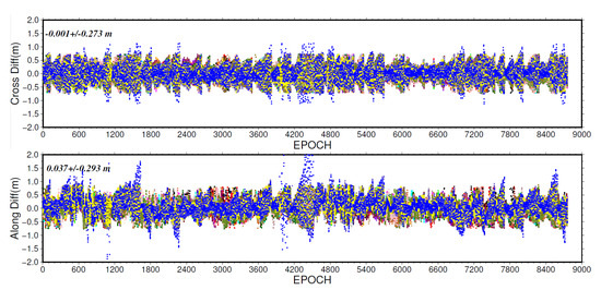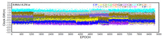 36]. There are differences in the underlying realization of the GNSS-specific system’s time scales. These differences are typically larger than the inherent precision of clock solutions, affect all satellites of a constellation in the same manner, and result in a systematic bias that may vary from epoch to epoch. To account for this bias, an ensemble clock difference was therefore computed at each epoch from the average broadcast-minus-precise clock values of satellites in a constellation. Subsequently, each clock offset difference was corrected for this ensemble’s average [