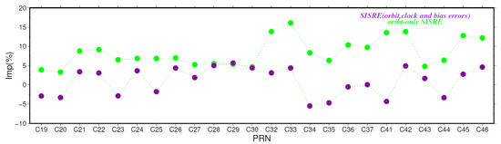 Figure 9. For each satellite, the improvement ratio of SISRE_ORB was positive, and the improvement ratio of SISRE exhibited both positive and negative values. In this case, SISRE_ORB was mainly affected by the orbit radial error, while SISRE was affected by the dual effects of the orbit radial error and clock error.