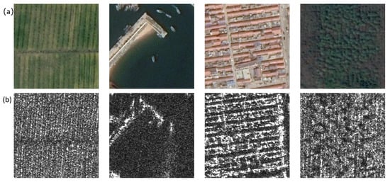 Abundant pure backgrounds of SAR images in QXS-SAROPT dataset. (a) SAR images; (b) optical images. cropland; the surface of the water; residential building; forests. The QXS-SAROPT dataset under open access license CCBY is publicly available at https://github.com/yaoxu008/QXS-SAROPT (accessed on 17 October 2023) [24].