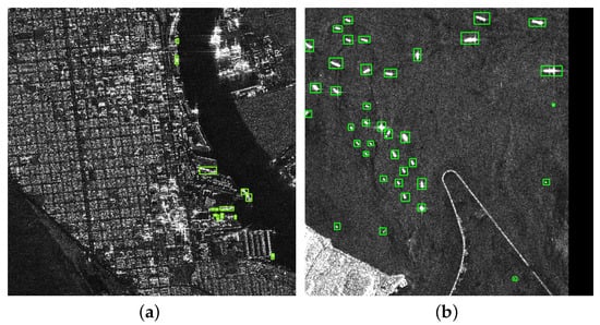 Ships marked in green boxes in a complicated ocean background. Figure (a) shows the SAR image from the HRSID dataset and Figure (b) shows the SAR image from LS-SSDD-V1.0.