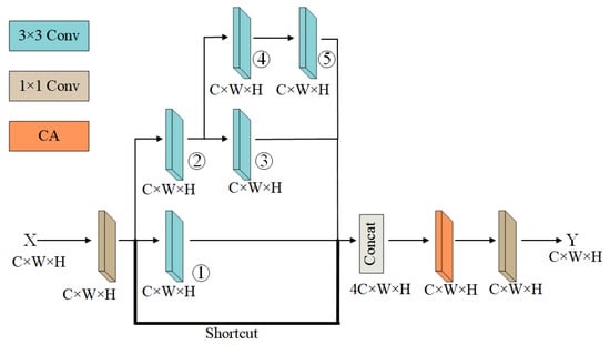 Concat’s form of concatenation allows us to obtain a feature map with four times the number of channels as the input feature map X. To capture the relationships between these channels, Concat is followed by CA. CA not only makes full use of the captured location information so that the region of interest can be captured accurately, it is also effective in capturing the relationships between channels, which effectively enhances the ability of the AMMRF to learn feature representation.