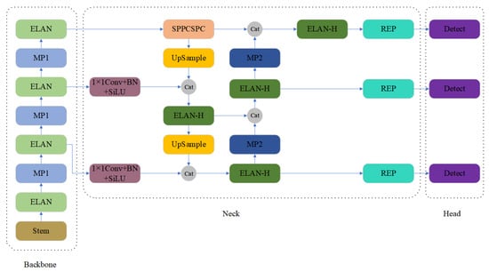 In this subsection, the differences between our network structure and YOLOv7 will be compared and then the advantages of YOLO-SARSI will be described. The network architecture of YOLOv7 [20] is shown in Figure 4. YOLOv7 is an anchor-based detection framework. The input image is fed into the backbone to extract features, and the backbone consists of Stem, ELAN, and MP1; the feature maps extracted from the backbone are processed by head to output three layers of feature maps with different sizes, and the neck consists of SPPCSPC, UpSample, ELAN-H, REP, and MP2. Finally, the output is processed by detecting prediction results.