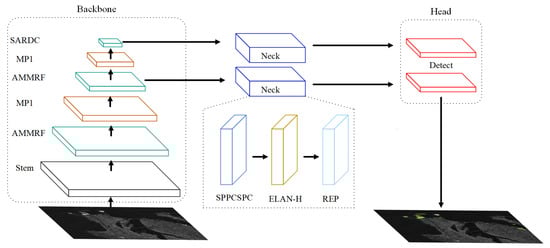 Based on YOLOv7, we propose a new network architecture, as shown in Figure 5, which we named You Only Look Once-SAR image Ship Identification (YOLO-SARSI). It is also divided into three parts: the backbone for feature extraction, the neck for reprocessing and rationalizing the features extracted from the backbone network, and the head for final prediction detection.