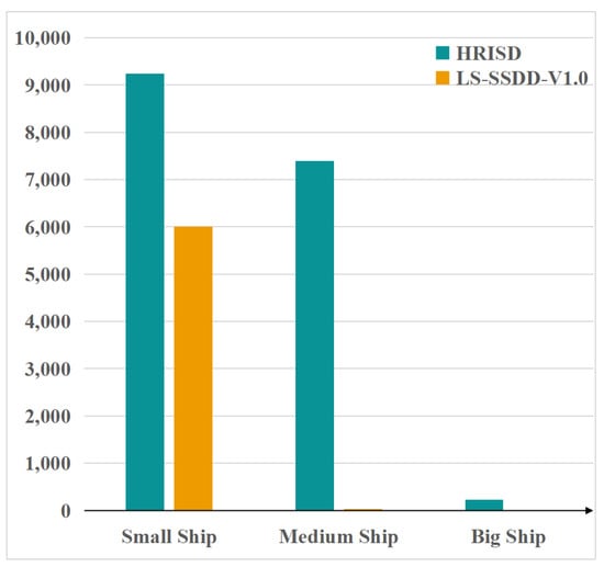 There are 5604 cropped SAR images and 16,951 ships in HRSID and 9000 cropped SAR images and 6015 ships in LS-SSDD-V1.0. The LS-SSDD-V1.0 dataset has more pure background images. The image size in both datasets is 800 × 800 pixels The ship pixel area in the image is used to measure the ship size, i.e., the relative pixel size, rather than the physical size. The average ship pixel area in LS-SSDD-v1.0 is only 381 pixels, while the average ship pixel area in HRSID is 1808 pixels. The dataset is divided into three types of ships based on their pixel area size: small ships (pixel area less than 482 pixels), medium ships (pixel area between 482 and 1452 pixels, and large ships (pixel area greater than 1452 pixels) [25,26]. The statistics of the number of ships of three sizes in the two datasets are shown in Figure 6.