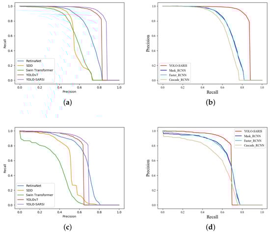 The horizontal axis of the PR curve is recall and the vertical axis is precision, which reflects the relationship between precision and recall. The area between the curve and the two axes is the . The higher the recall and precision, the better the model, i.e., the more convex the PR curve is, the better the model. The more convex the PR curve is, the better the model is. If the PR curve of one model is completely surrounded by the curve of another model, it can be concluded that the latter is better than the former. From Figure 7, it can be seen that the PR curve of YOLO-SARSI encompasses almost all other models.