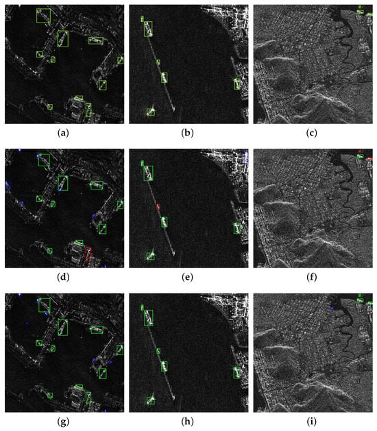 Diagram of HRISD results. Green boxes are ships that were detected correctly or boxes marked true, blue boxes are ships that were detected incorrectly, and red boxes are ships that were missed. (a–c): Ground truth; (d–f): YOLOv7; (g–i): YOLO-SARSI.