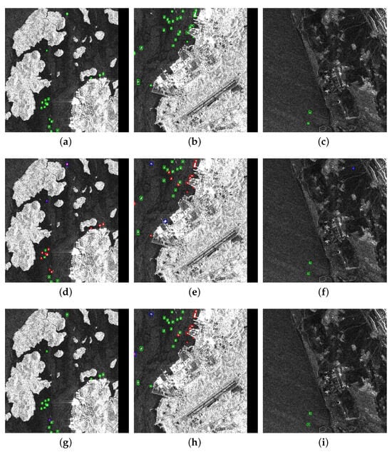 Diagram of LS-SSDD-V1.0 results. Green boxes are ships that were detected correctly, or boxes marked true, blue boxes are ships that were detected incorrectly, and red boxes are ships that were missed. (a–c): Ground truth; (d–f): YOLOv7; (g–i): YOLO-SARSI. Some of the ships in the figure have an IOU less than 0.5 between the blue box and the ground truth despite being surrounded by the blue box, and are therefore recognized as both misdetections and missed detections. Eventually, such ships will have rosy boxes.