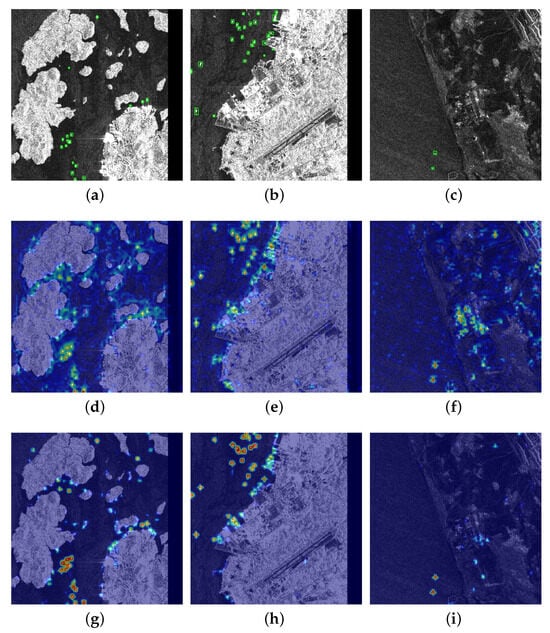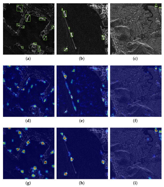 Diagram heat map of HRSID results. (a–c): Ground truth; (d–f): YOLOv7; (g–i): YOLO-SARSI.