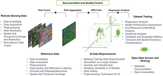 In summary, these requirements collectively underscore the pivotal role of training data in the accuracy and effectiveness of AI models in RS applications, particularly in the forest context. These requirements align with the findings from [34,35,36,37,39] and are fundamental in ensuring that AI techniques are effectively applied to RS data, ultimately advancing the field and promoting robust, reliable, and insightful analyses of RS data.