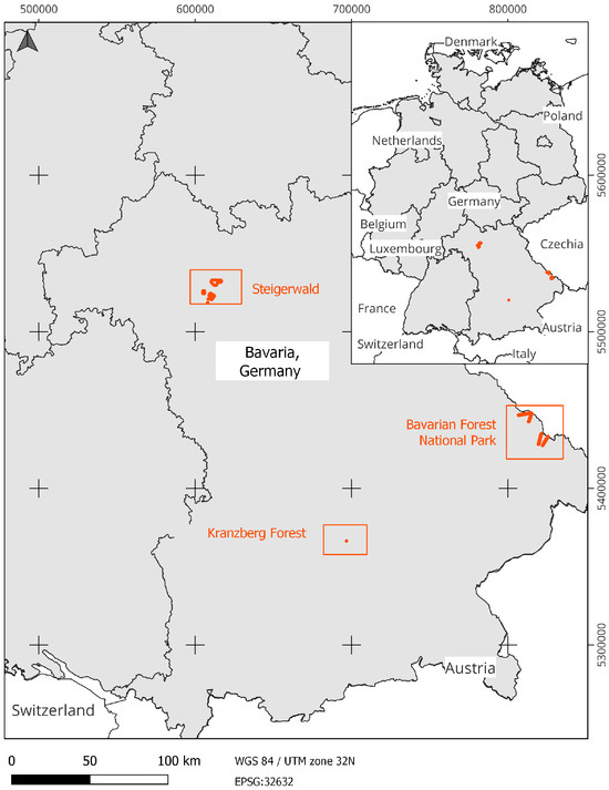 Within this study, three distinct areas of interest (AOI) were meticulously examined (as illustrated in Figure 2). The reference data employed for analysis correspond to these specific regions, encompassing large parts of the Bavarian Forest National Park [44,45], situated at coordinates 49°15′N, 13°15′E, where the data were acquired via helicopter in 2016, covering a vast expanse of 1443 hectares. Additionally, the study included the Steigerwald Forest [46], located at coordinates 48°25′N, 11°40′E, with data collected using a helicopter in 2017, encapsulating an area of 2600 hectares. Furthermore, the investigation extended to the Kranzberg Forest [47], positioned at coordinates 49°53′N, 10°32′E, where the dataset was acquired through UAVs in 2020, focusing on a more confined seven-hectare terrain. These diverse areas provided a rich and varied dataset essential for the comprehensive analysis conducted within this study.