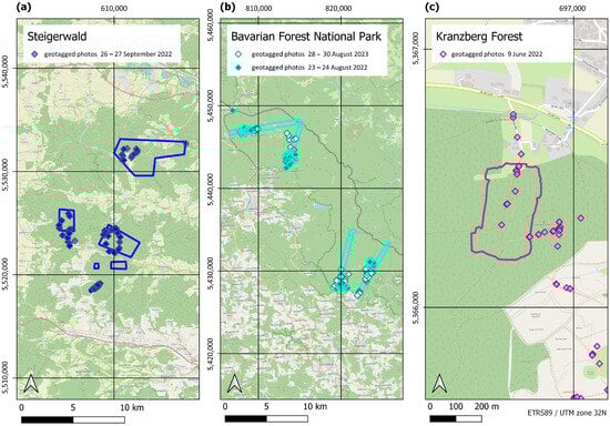 Ground truth from field campaigns in the three designated study sites (a) Steigerwald, (b) Bavarian Forest National Park, and (c) Kranzberg Forest.