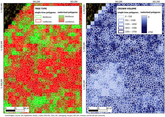 Exemplary aggregation results of the tree segments onto the 10 m grid of the raster data, displaying the tree class (left) and the crown volume (right) of a subset in the Bavarian Forest National Park test site (AOI 2).