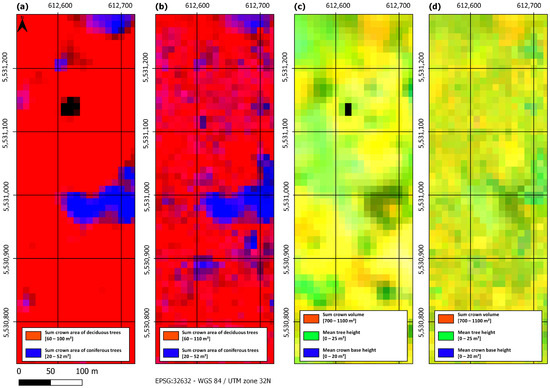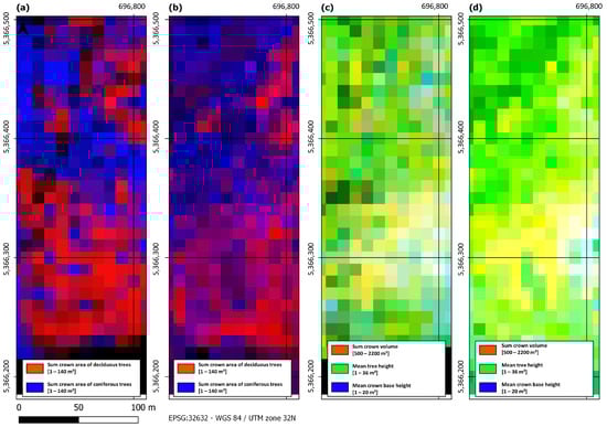 Within the equation, a represents the area of the intersected polygons and h represents either tree height or crown base height depending on the specific attribute being calculated. Equation (1) is applied to all polygons within a raster cell. The area of the intersected polygons thus serves as a means to proportionally adjust the attribute heights in accordance with the portions of their area within a given raster cell. The tree type labels, categorizing trees as deciduous, coniferous, or deadwood, have their areas calculated per pixel. This is achieved by aggregating the area of all polygons with their respective tree type within a pixel grid. The counts of these areas are summarized for each tree type, with the previously described area ratio method applied per tree type. In addition to the tree type areas, a percentage value denoting the tree type coverage of a pixel is calculated. The resulting value represents the proportion of the grid cell’s area occupied by tree segments, with each cell standardized to 100 square meters. It is important to note that this calculation does not consider overlapping polygons.