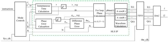 Therefore, the paths of the LFM signal phase can be concurrently computed in real-time without requiring additional logic and DSP resources. Following the phase calculation, the waveform can be obtained using cosine and sine functions. These complex calculations can be realized in HLS IP to simplify the complexity of implementation. In Figure 5, the block diagram demonstrates the implementation of complex computations in HLS IP. Simultaneously, when combined with the characteristics of FPGA, utilizing registers and pipelines can achieve parallel computation through piecewise linear approximation. Consequently, this method of waveform generation can execute advanced signal processing in real-time.
