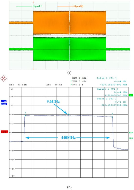 The LFM signal has a bandwidth of 440 MHz and a time width of 120 µs: (a) the I and Q signal waveforms, captured by the high-speed oscilloscope, have a time width of 120 µs; (b) the spectrum of the modulated signal shows a center frequency of 9.6 GHz and a bandwidth of 440 MHz.
