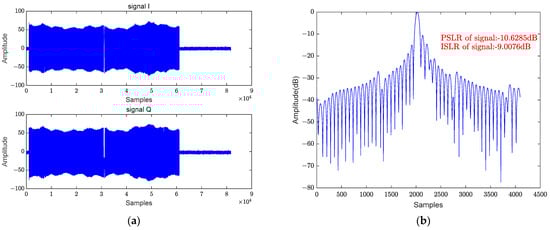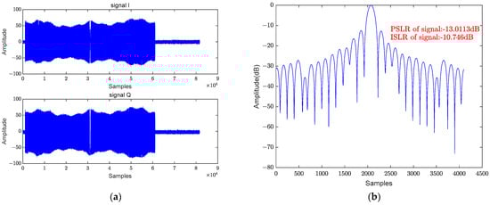 After acquiring the coefficients of the polynomial formula, the parallel calculation expressions could be acquired, and the proposed compensation algorithms could be implemented in the digital synthesis hardware using the HLS method. To validate the effectiveness of the compensation, we tested it in the closed-loop mode. As depicted in Figure 11a, the recorded waveforms of I and Q were accurate, with the PSLR and ISLR of the recorded data at −13.0113 dB and −10.746 dB, respectively, as depicted in Figure 11b, which were nearly identical to the ideal signal.