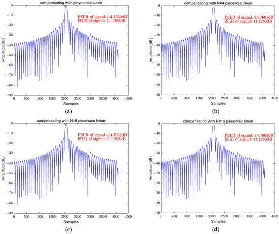 After acquiring various approximation curves and offsetting the phase errors in the signal, the compensation effects of different curves could be determined. The results of pulse compensation are depicted in Figure 10. As shown in Figure 10a, when compensated with the polynomial curve, the PSLR was −14.7659 dB and the ISLR was −11.1263 dB. As depicted in Figure 10b, when compensation was applied using an = 4 piecewise linear curve, the PSLR was −14.7661 dB and the ISLR remained at −11.1263 dB. Similarly, in Figure 10c,d, it can be seen that compensating with = 8 and = 16 piecewise linear curves both yielded a PSLR of −14.7662 dB and an ISLR of −11.1263 dB. Given the nearly identical results of these compensated signals, it can be concluded that the application of piecewise linear curves with different values achieves the same effect as the polynomial curve.