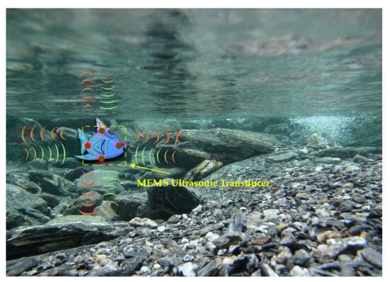 Therefore, a novel CMUT structure based on silicon-silicon bonding technology is proposed for the obstacle avoidance application of underwater miniature fish-shaped robots. This design uses the thickness of the silicon oxide to determine the height of the cavity and employs silicon oxide on the membrane, instead of using it as an insulating layer at the bottom of the cavity. This results in a more consistent cavity structure, simplifying the fabrication process and improving bonding stability. The CMUTs are arranged around the fish-shaped robot to achieve underwater obstacle avoidance. Figure 1 illustrates the fish-shaped underwater obstacle avoidance robot. Additionally, a finite element model is established in this paper to simulate and calculate the CMUT’s performance. The CMUT’s performance is tested underwater and the feasibility of underwater obstacle avoidance is verified. The experimental results demonstrate that the CMUTs fabricated in this study meet the requirements for underwater ultrasonic obstacle avoidance applications and provide a reference for subsequent related research.