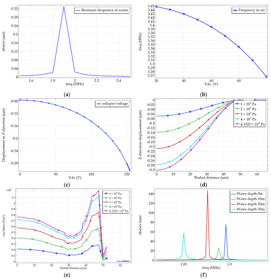 CMUT performance simulation results: (a) harmonic response; (b) spring softening; (c) collapse voltage; (d) membrane displacement under hydrostatic pressure; (e) diaphragm stress under hydrostatic pressure; (f) resonant frequency at different loads.