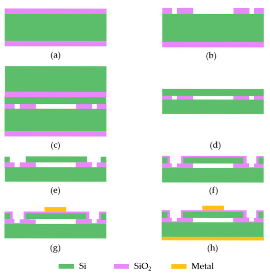 Si-Si bonding process flow diagram: (a) double-sided oxidation of bulk silicon; (b) RIE etching of cavities and alignment marks; (c) vacuum bonding; (d) CMP thinning + TMAH etching to remove the SOI substrate and BOE to remove the buried oxygen layer; (e) DRIE windowing to expose the alignment marks; (f) PECVD SiO2; (g) magnetron sputtering pattern for the upper electrode; (h) BOE employed to remove silicon oxide and magnetron sputtering to lower electrode.