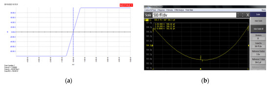 Initially, the bare die undergoes a check for electrical performance. Alloy annealing can be used to enhance chip performance if the expected results are not achieved. Evaluating the electrical performance of an ultrasonic transducer is the primary step in confirming its suitability for underwater applications. The CMUTs are then subjected to I-V testing, C-V testing, and impedance testing in air using a 4200-SCS semiconductor parameter analyzer, as depicted in Figure 7. The I-V test result, shown in Figure 7a, displays a straight line through the origin, indicating good ohmic contact between the metal and the silicon. The C-V test result, presented in Figure 7b, exhibits a U-shaped curve, indicating that the chip’s capacitance varies with static voltage, meeting the design requirements. The impedance analyzer measures the CMUT’s impedance in air, and, when a DC bias and a small AC signal are applied between the upper and lower electrodes, resonance peaks appear. The real and imaginary impedance are depicted in Figure 7c,d. The measured impedance matches the circuit parameters in Figure 3.