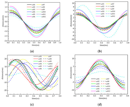 CMUT micro−element vibration displacement curves at different frequencies: (a) 1.7 MHz; (b) 1.75 MHz; (c) 1.8 MHz; (d) 1.82 MHz.