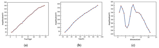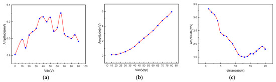 CMUT reception performance test: (a) changing the transmission of AC; (b) changing the receiving DC bias voltage; (c) changing the receiving distance.