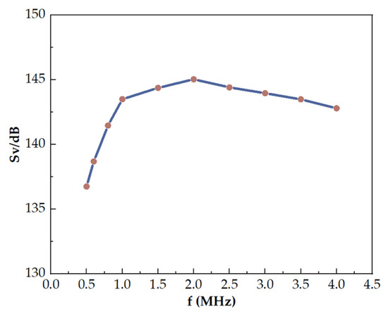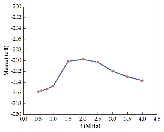 The transmit voltage response of the CMUT refers to its response in transmission mode when excited by an electrical signal, leading to the generation of an acoustic field at a distance of L in the pointing direction. It characterizes the transducer’s ability to emit signals and provides information about the amplitude and frequency characteristics of the transmitted signal. The test platform for measuring the emission response is depicted in Figure 14. In this test system, the CMUT being examined acts as the transmitter, while a needle hydrophone positioned 20 cm in front of it serves as the receiver. Throughout the test, the transmitter emits five cycles of signals, with frequencies ranging from 500 kHz to 4000 kHz. The signal amplitude of the receiver is utilized to calculate the transmission response of the CMUT. The emission reaches a maximum of 145.05 dB at 2 MHz. The test results are presented in Figure 15.