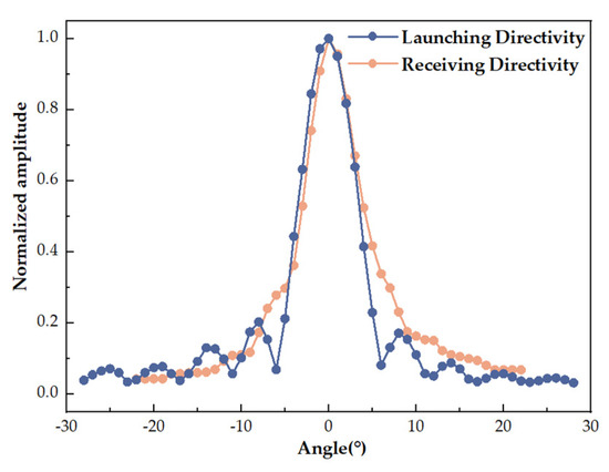 Directivity, which refers to the ability of a sensor to transmit and receive ultrasound in a specific direction, plays a crucial role in CMUT applications for underwater obstacle avoidance. It enhances target detection and localization accuracy, obstacle detection and classification, and distance measurement. To evaluate the emission directivity of the CMUT, a test environment was set up, as shown in Figure 16. The setup includes a rotatable device attached to a cylindrical cylinder, with a precision indexing turntable mounted beneath the encapsulated end of the CMUT. The excitation signal had a frequency of 2 MHz, an amplitude of 20 Vpp, and consisted of five continuous sinusoidal pulses with a DC bias of 30 V. The sound field was perpendicular to the cylinder wall. A standard power transducer was positioned at a fixed distance of 20 cm from the transmitter, at the same height as the center of the CMUT. The test involved rotating the system in 1° increments, with the receiver at the center, covering a 30° rotation on each side. This allowed a comprehensive evaluation of the CMUT’s emission directivity. Figure 17 illustrates the results of this test. Additionally, the same procedure was followed to assess the receiver’s directivity, replacing the CMUT with a calibrated piezoelectric transducer to act as the transmitter and positioning the CMUT at the hydrophone’s location to act as the receiver. The receiver directivity results are also displayed in Figure 17. The CMUT used in these tests demonstrated a primary flap width of 7.3° at −6 dB, indicating its ability to accurately determine and locate obstacles. Placing multiple CMUT elements in the front of a fish−shaped robot can provide accurate forward positioning, expanding the field of view for obstacle avoidance.