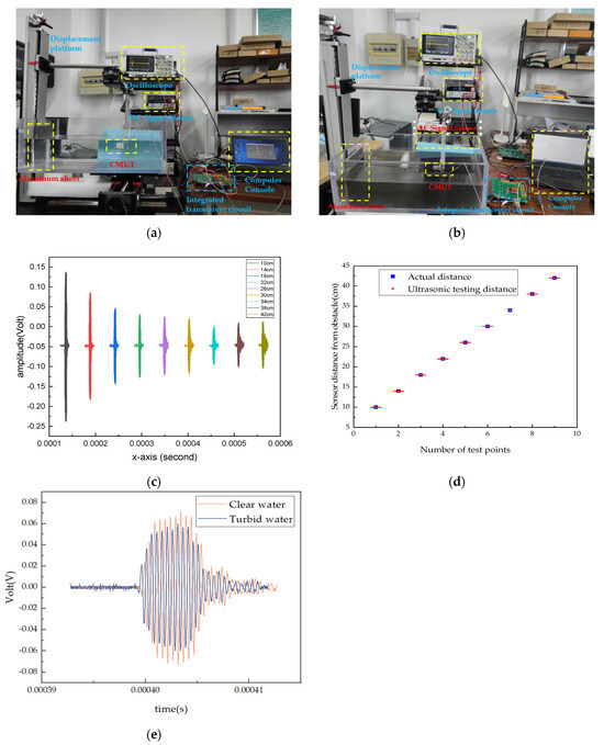 Underwater obstacle avoidance involves emitting high-energy ultrasound through an ultrasonic detector. After receiving the reflected waveform, the distance and direction of the target can be calculated. The system can determine whether to initiate obstacle avoidance actions, such as moving forward or backward, by comparing the measured value with a pre-defined threshold. An experimental test platform, illustrated in Figure 18a, was used to verify the feasibility of using the CMUT in obstacle avoidance. In this test, an aluminum block served as an obstacle. The CMUT was employed to transmit ultrasonic signals and receive the waves reflected from the aluminum block. A computer console emitted a 10-cycle sinusoidal pulse signal with a DC bias of 30 V and an AC signal of 10 Vpp. The test involved measuring the reflected signals at distances from 22 cm to 42 cm in 4 cm increments. The received signals were then amplified by 40 dB, as depicted in Figure 18c. Additionally, the discrepancy between the tested distance and the actual distance was analyzed. Error bars were determined by analyzing the reflection data from the aluminum plate at various distances of the ultrasonic sensor. The mean value was used as the central tendency metric, while the standard deviation was employed. The obtained results demonstrated a standard deviation of less than 0.05 at various test distances, as depicted in Figure 18d. Furthermore, sand and ink were added to the water to simulate turbid water, as shown in Figure 18b. The reflected signals in clear and turbid water were compared at a distance of 30 cm, as displayed in Figure 18e. The presence of sand particles led to signal scattering and an increase in the speed of propagation. Consequently, the reflected signal in turbid water exhibited an ahead phase of about 0.27 µs compared to the signal in clear water, accompanied by an amplitude reduction of about 23.36 mV. These findings indicate the feasibility of CMUTs for use in obstacle avoidance in turbid water.