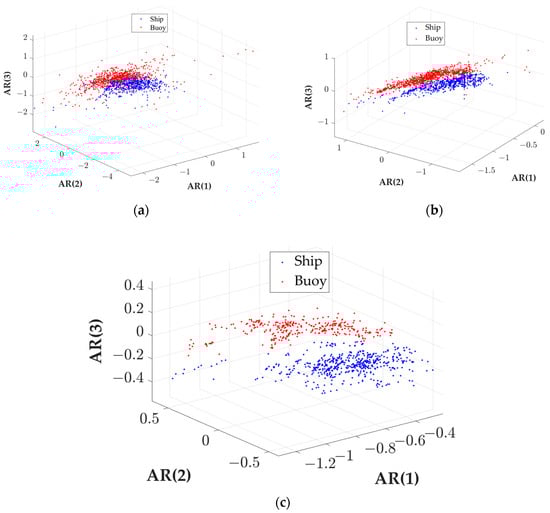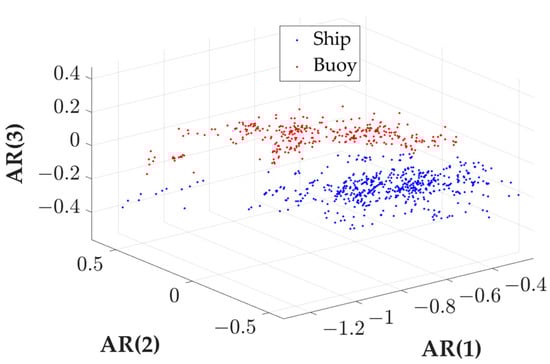 Experiments employing Dataset D were conducted, where a Doppler spectrum was computed once every 256 pulses and centroid features were extracted. A sequence of 50 continuous centroids was modeled using the AR(3) model in one instance, depicting the distribution of ship targets and floating small targets (buoys) within the AR coefficient domain of the centroid sequence; as clearly illustrated in