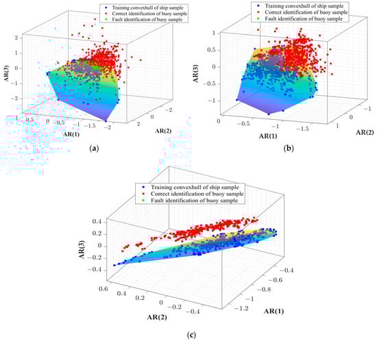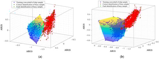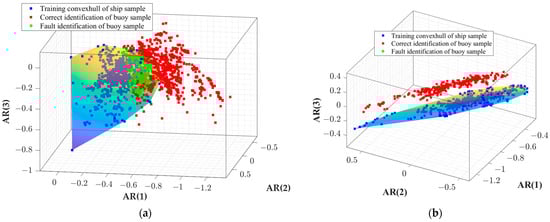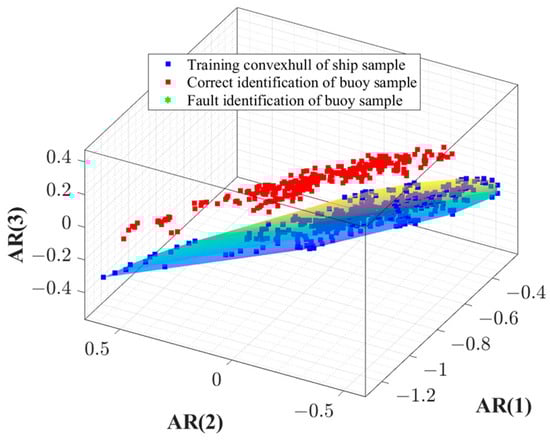 Figure 6, this achieves a buoy correct identification rate of 100%. It is evident that ships and buoys possess excellent distinguishability in the AR coefficient domain of the centroid sequence, and under certain parameter conditions, the convex hull classifier trained with ship samples can achieve a classification accuracy of 100% for both ships and buoys. Experiments using Data A, Data B, and Data C also attained a favorable distinguishing effect, wherein the results, as displayed in
