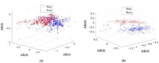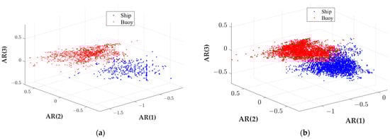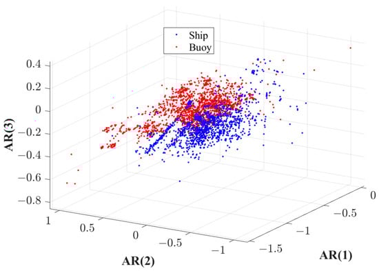 Figure 14, reveal a correct buoy classification identification rate of 69.4%. It is apparent that increasing the number of overlapping pulses used for adjacent features significantly reduces the distinguishability between ships and buoys in the centroid sequence’s AR model coefficient domain, primarily due to the alteration of the temporal structure information of the centroid sequence, subsequently affecting the AR modeling coefficients and reducing the distinguishability between ships and buoys.