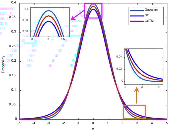 The heavy-tailed characteristic of Student’s t-distribution is modulated by a degrees-of-freedom parameter, and the thickness on either side of the probability curve is correlated with the degrees of freedom. As the degree of freedom tends toward a Gaussian distribution, the more critical the heavy tail, and the smaller the heavy tail, the larger the degree of freedom [39]. The GSTM distribution uses the mixture probability parameter to adaptively adjust the probability of Student’s t-distribution and the Gaussian distribution to match the true noise distribution, as shown in Figure 1. Figure 1 shows that there are differences between the three distributions near the center point. As the distance range increases, the difference between the three distributions narrows and then increases. This suggests that the GSTM distribution may perform better than the Gaussian distribution and Student’s t-distribution, regardless of whether the situation is normal or abnormal.