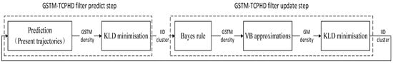 At time , the multitarget posterior probability hypothesis density,, and the posterior potential distribution, , are known. The GSTM-TCPHD filter is predicted and updated as follows [40].
