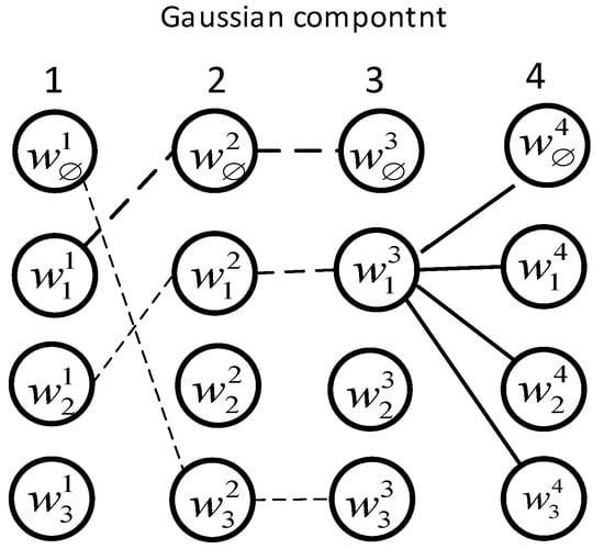 At time , assuming the existence of sensors, the set of measurements is denoted as . Let , denoting that the subset W takes, at most, one measurement from the set of measurements of each sensor, and all belong to the same PHD component; denotes the set of all measure subsets of W. For a mutually exclusive subset of W, let represents the set of clutters generated by all sensor measurements [33]. The set of measurements can be divided into
