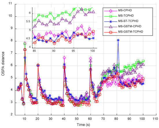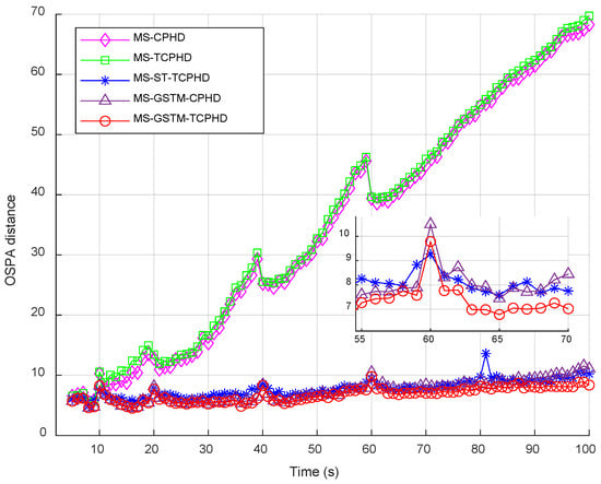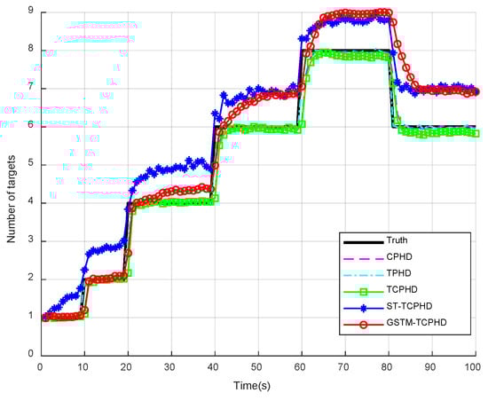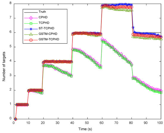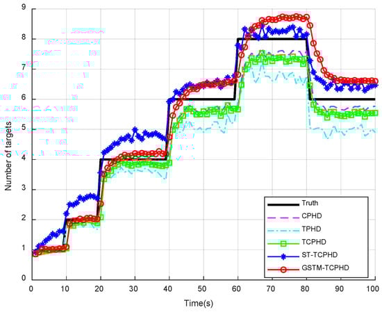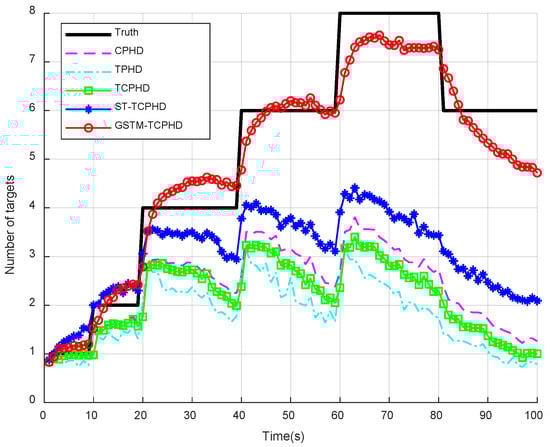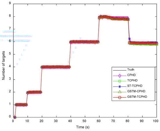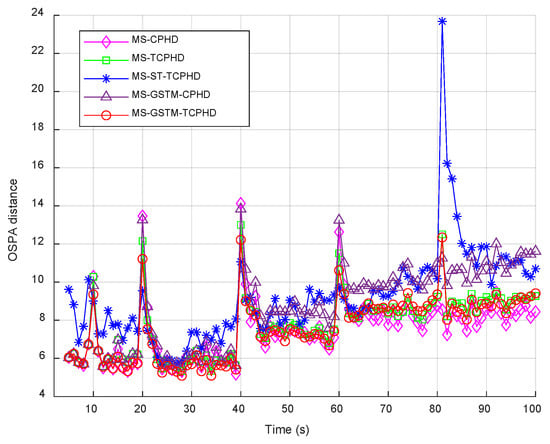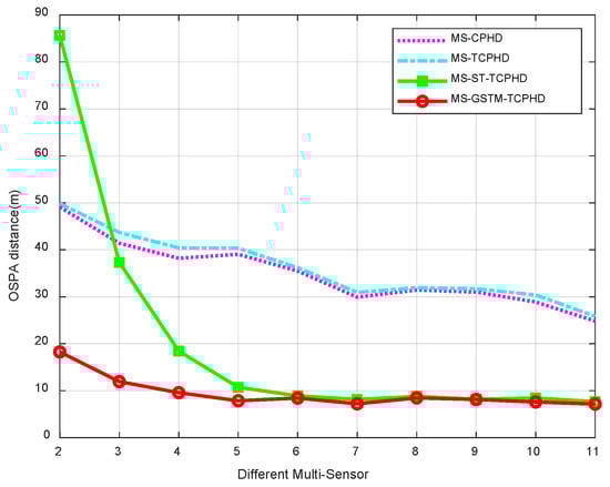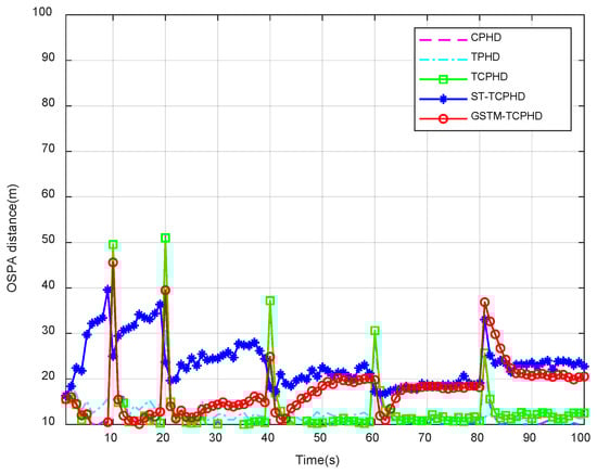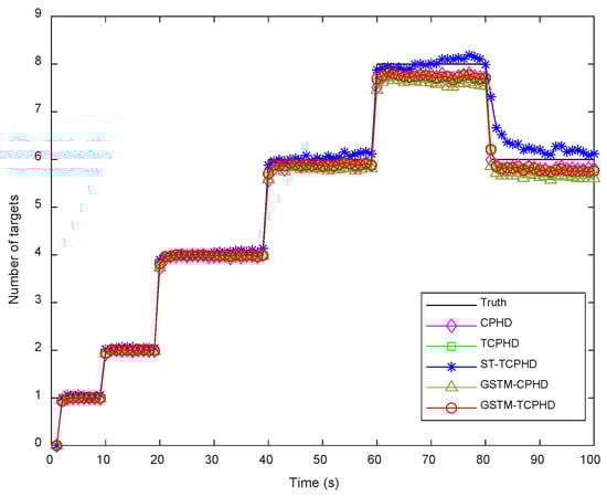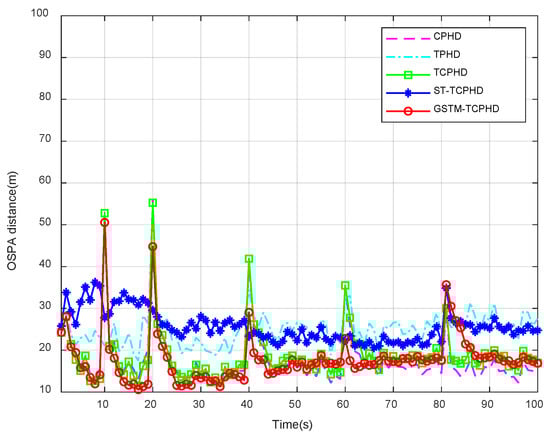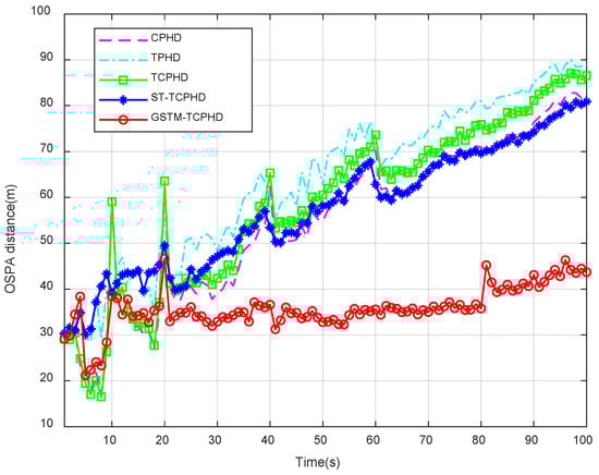 We conducted Monte Carlo simulations of the filters to compare OSPA distances and cardinality errors. The simulation results show that the error of the CPHD/TPHD/TCPHD filter gradually increases in the presence of heavy-tailed noise, eventually leading to divergence. In contrast, the GSTM-TCPHD filter achieves stable tracking with minimal cardinality errors. Furthermore, compared with the GSTM-TCPHD filter, the MS-GSTM-TCPHD filter further reduces OSPA distance and exhibits improved tracking accuracy in multi-sensor scenarios. Additionally, we also compared filters using Student’s t-distribution to model heavy-tailed noise. According to the results, our suggested filter operates more efficiently and requires less time to operate, all while exhibiting smaller OSPA distance and cardinality errors. To sum up, a greater variety of scenarios can be covered by our suggested filter.