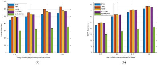 OSPA distance with different heavy-tailed noise probabilities: (a) state remains unchanged, and measurement noise has different heavy-tailed probabilities; (b) measurements remain unchanged, and state noise has different heavy-tailed probabilities.