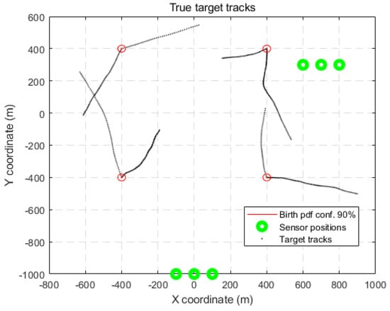To explore the performance of the proposed MS-GSTM-TCPHD filter, six sensors are arranged in the scene. The sensor positions are , , , , . The sensor location and the simulated primary path are shown in Figure 14, where the green hollow circle is the sensor location, and the black line represents the trajectory map of the primary simulation. The red circle is the born region. Each sensor has a certain probability of appearing as a quantitative wild value, and there is a total of eight target appearances and extinctions in the scene.