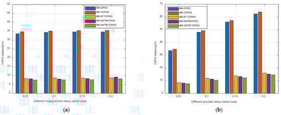 Multi-sensor OSPA distance with different heavy-tailed noise probabilities: (a) state remains unchanged, and measurement noise has different heavy-tailed probabilities; (b) measurements remain unchanged, and state noise has different heavy-tailed probabilities.
