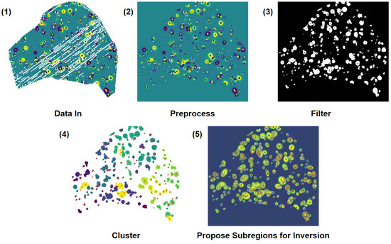 Pipeline for the proposal of subregions for inversion. The data are read in (1), preprocessed (2), and filtered by a threshold (3). The remaining points undergo hierarchical clustering, which is a type of unsupervised machine learning (4). Finally, an ellipse is fit to each cluster to propose subregions for inversion (5).