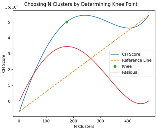 We then perform hierarchical clustering using the single distance metric on the filter’s two-dimensional binary gridded output. If the survey is large, we divide it before clustering to improve performance and then stitch the results back together. We automatically select the initial number of clusters by computing the Calinski–Harabsz (CH) score for a varying number of clusters, with the CH score knee point indicating the optimal choice [15]. The knee point is calculated by determining the point on the CH score curve with the maximum perpendicular distance from the straight line joining the first and last point on the curve (Figure 2). Large clusters are then further divided by recursively clustering using Ward’s distance metric of minimum variance until each cluster is smaller than 20 m2.
