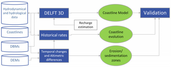 The methodology employed in this study is described in Figure 3. It encompassed three primary processes: the establishment of a coastal numerical model, two GIS studies dedicated to finding and quantifying historical geomorphological changes (DEM and DBM alterations) and tracking coastline evolution for model evaluation.